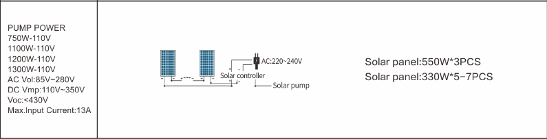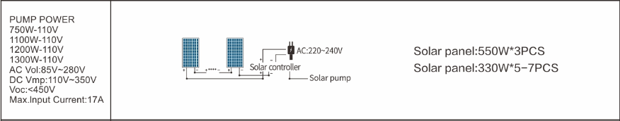 | ITEM | Built-in Controller Model | Voltage(AC) | Optimum input voltage(DC) | Power | Max.Flow | Max. Head | Outlet | Cable | Open circuit voltage(VOC) | VOC(-IN Model) |